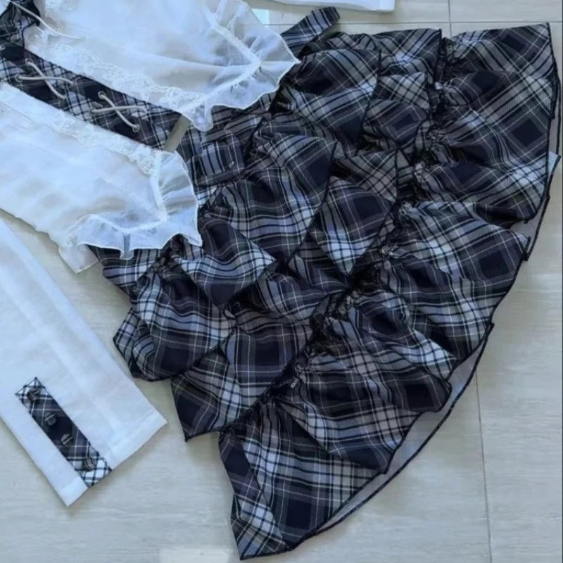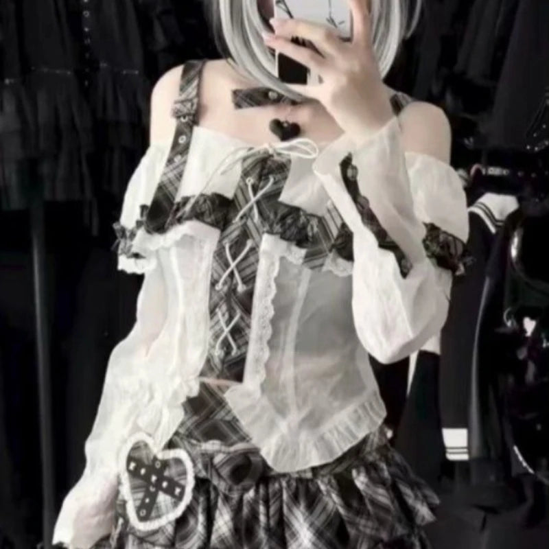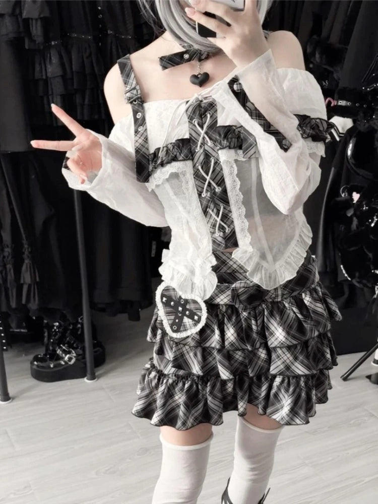 Japanese Punk Sweet Two Piece Sets Women's One-shoulder Lace Blouse + Plaid Cake Skirt New Vintage Fashion Harajuku Y2k Outfits