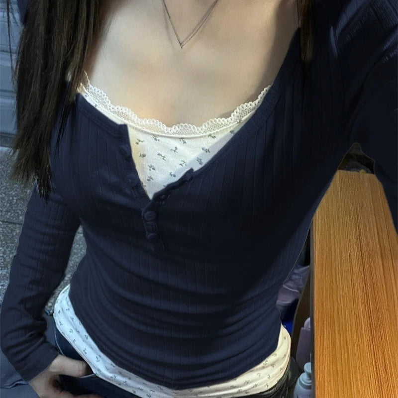 Women Streetwear Fake Two Pieces Long Sleeve T-shirt Floral Lace Trim Casual Slim Fit Tees Female Autumn Winter Bottoming Top